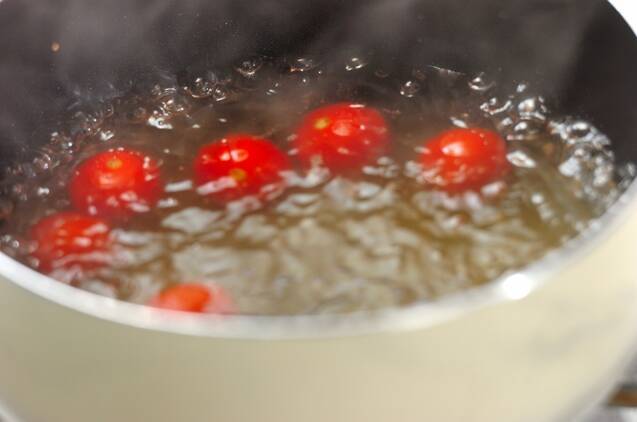 鍋に固形チキンスープの素、水を入れて中火にかけ、煮たったら春雨、プチトマトを加え、2~3分煮る。