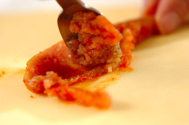 <明太子ダレ>の明太子は薄皮に切り込みを入れ、中身をしごき出し、他の材料と混ぜ合わせる。
