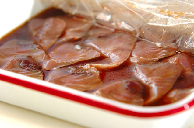 バットに<合わせダレ>の材料を混ぜ合わせ、カツオを漬ける。