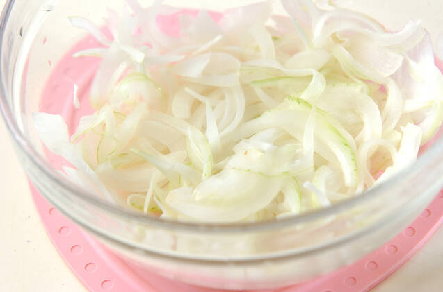 玉ネギは縦半分に切って縦薄切りにし、ほぐしながら耐熱ボウルに入れる。ラップをして電子レンジで2分加熱し、しんなりしたら(1)のバットに漬け込む。電子レンジは600Wを使用しています。