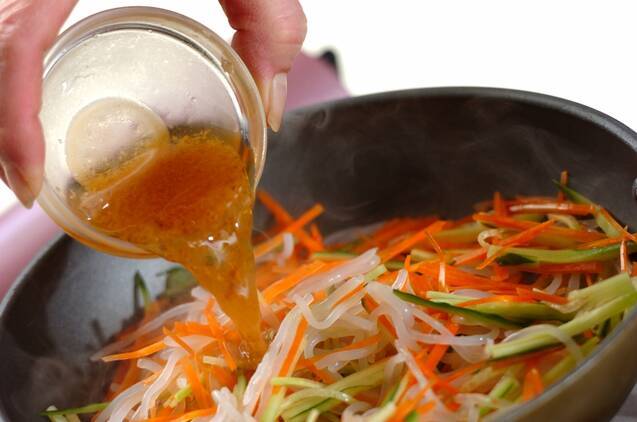 (1)にニンジンとキュウリを入れ、サッと炒め合わせたら火を止め、<ドレッシング>を入れて和える。