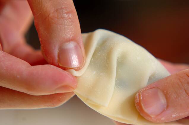 餃子の皮に(1)を大さじ1位のせ、皮のフチに水を薄くぬってひだを取りながら包む。