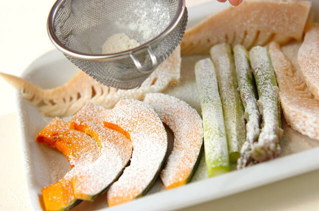 イワシ、カボチャ、水煮タケノコ、グリーンアスパラに小麦粉大さじ1を薄くつける。