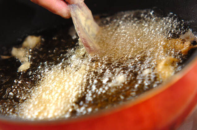 ボウルで<衣>の材料をサックリ混ぜ合わせ、(1)を通して170℃の揚げ油に入れ、サクッと順に揚げる。