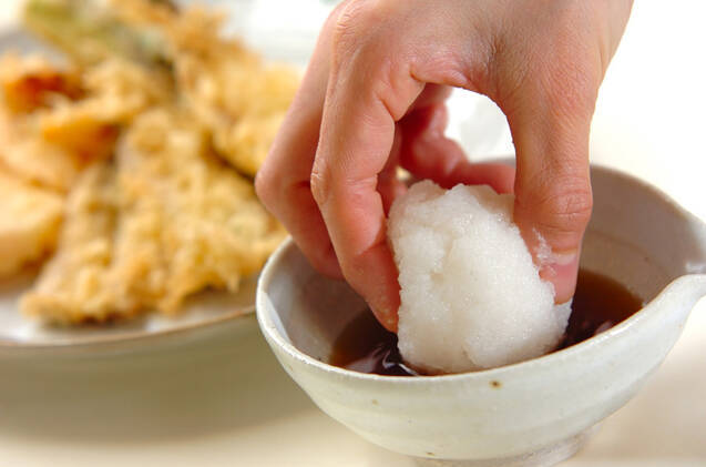 器に(2)を盛り合わせ、<天つゆ>と大根おろし、ショウガを添える。