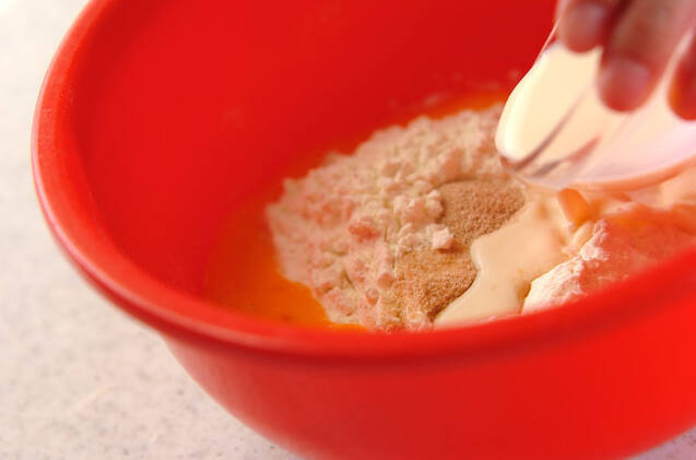 ボウルに強力粉を入れ、きび砂糖、インスタントドライイーストを真ん中におく。溶き卵、塩をはしにおき、温めた豆乳をかけてカードでひとまとまりになるまで混ぜる。