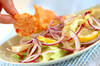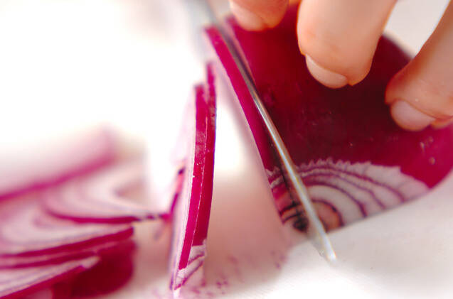 紫玉ネギは縦薄切りにして水にさらし、軽くもみ洗いして水気をきる。