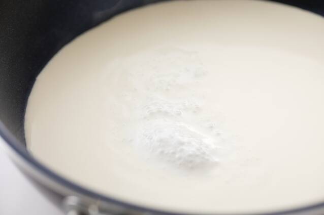 別の鍋に牛乳と生クリームを入れて温める。沸騰させない。