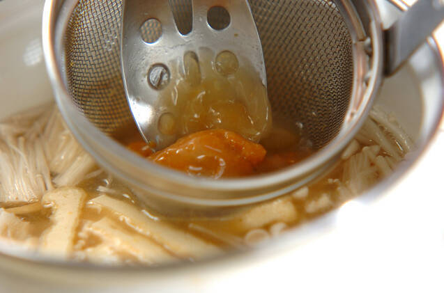 エノキがしんなりしたら、みそを溶き入れて火を止める。器に注ぎ、刻みネギを散らす。