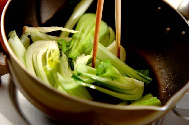 フライパンにサラダ油を中火で熱し、チンゲンサイの根元を入れて炒める。