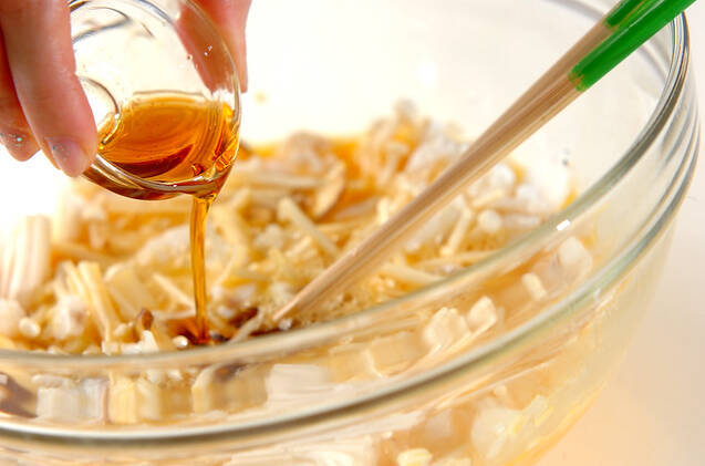卵液にタラ(酒ごと)、白ネギ、生シイタケ、エノキ、残りのゴマ油を加え、よく混ぜ合わせる。