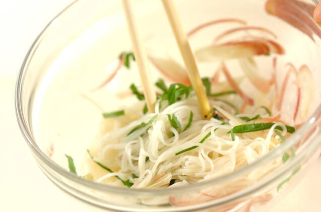 素麺は半分に折ってサッとゆで、水洗いしてザルに上げ、水気をきって、ミョウガ、大葉を混ぜ合わせる。器に入れ、冷やした<梅汁>を注ぎ入れる。