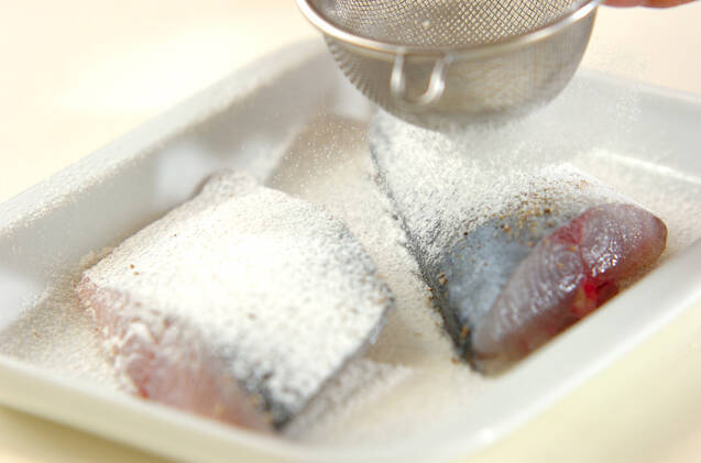 サワラはサッと水洗いして水気を拭き取り、両面に塩、白コショウを振り、小麦粉を全体に薄くまぶす。