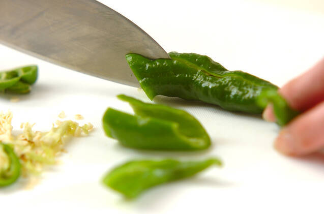 甘長唐辛子は水洗いして水気を拭き取り、ヘタを切り落として縦に切り込みを入れ、種をかき出し、斜め3~4つに切る(種が気にならない場合は種付きのままでもOKです)。