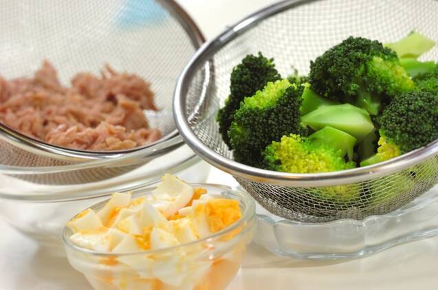 ブロッコリーは食べやすい大きさに切り、分量外の塩を加えた熱湯でゆで、ザルに上げて水気をきる。ゆで卵はザク切りにする。ツナはザルに上げ、油をきる。