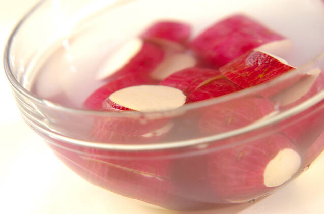 サツマイモは皮ごときれいに水洗いし、両端を切り落として長さ3cmに切る。すぐに塩を加えた水に30分以上放ち、アクを抜く。(ヒント)調理時間に水に放つ時間は含まれていません。