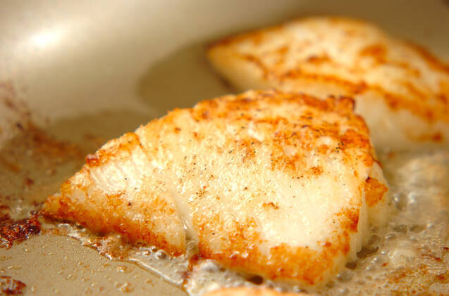 フライパンにバターを入れて中火にかけ、白身魚を入れ(盛り付けた時に上になる側を下にして並べ)、おいしそうな焼き色がついたら引っくり返す。