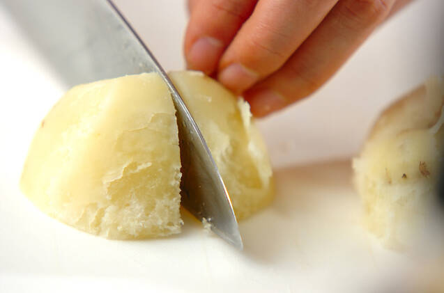 柔らかくなったジャガイモの皮をむき、ひとくち大に切ってボウルに入れる。