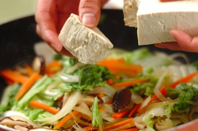 フライパンに残りのサラダ油を加えて中火で熱し、玉ネギ、ニンジン、白菜、シイタケを炒め合わせる。少ししんなりしたら、木綿豆腐を手でザックリちぎりながら加え、炒め合わせる。