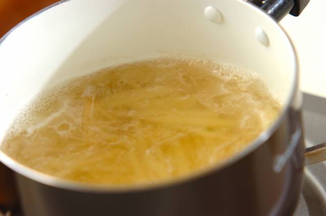鍋にだし汁と新ジャガイモを入れて中火にかけ、火が通るまで煮る。