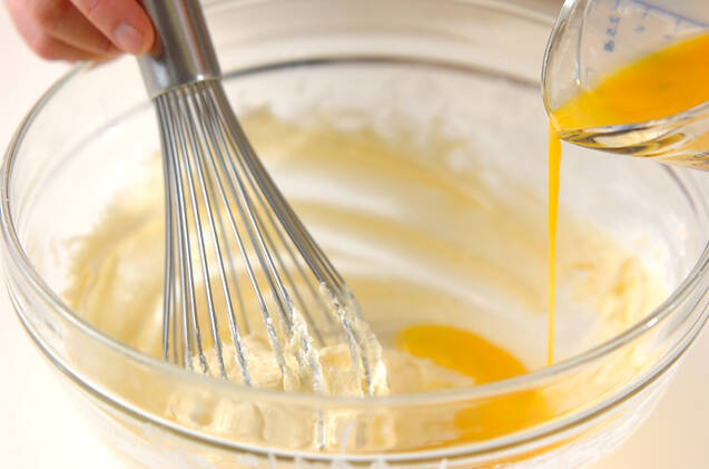 溶きほぐした卵を少しずつ加えながら、そのつどよく混ぜ合わせる。