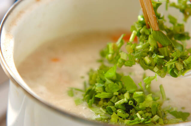 板コンニャクを加え、酒粕が煮とけていたらセリを加え、ひと煮たちさせて薄口しょうゆで味を調える。器によそい、お好みで一味唐辛子または七味唐辛子を振る。