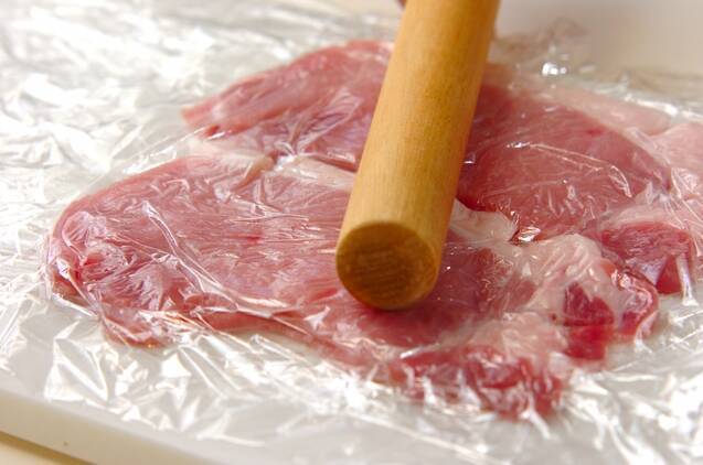 豚ロース肉の脂身と赤身の間の筋に包丁の先を使い、切り目を入れる。脂身の部分は3~5cmごとに切りこみを入れる。軽くたたいてのばす。<ソース>の材料を混ぜ合わせる。