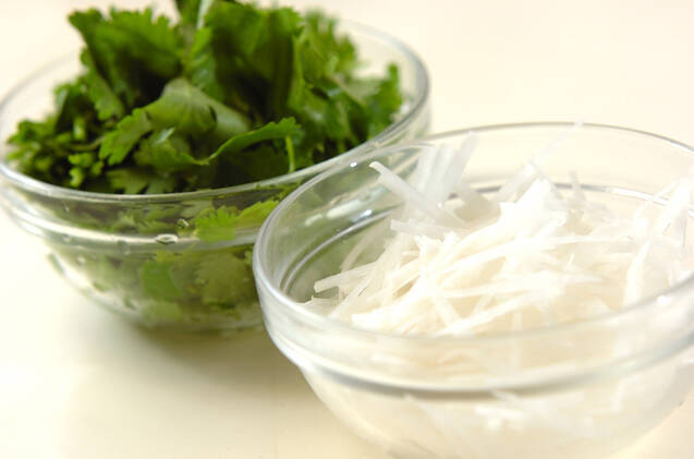 香菜は根元を切り落とし、長さ4cmに切る。大根は皮をむいてせん切りにする。