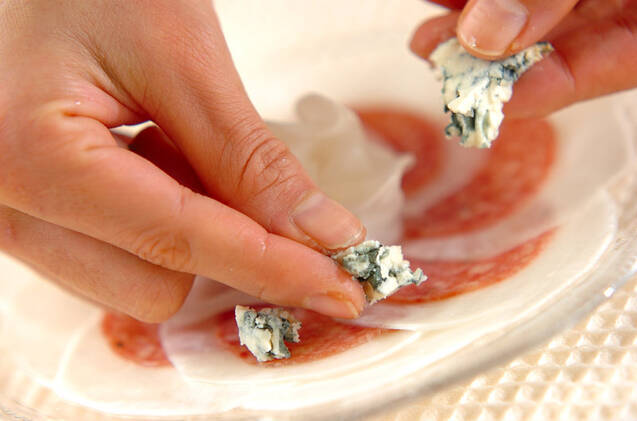 器にカブとサラミを少し重なるように盛り、ブルーチーズをちぎりながらのせ、EVオリーブ油をかけて粗びき黒コショウを振る。
