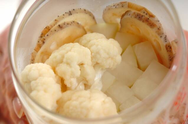 熱湯に(1)を入れ、30~40秒ほどゆでる。ザルに上げ、密封できる保存容器に詰める。