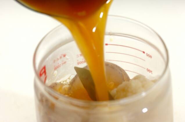 <ピクルス液>を注ぎ入れ、保存容器の蓋を閉める。粗熱が取れたら冷蔵庫に入れ、漬け込む。