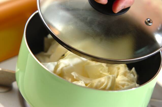 (1)と水を小鍋に入れて火にかけ、煮たったら弱火にして小鍋に蓋をし、蒸し煮にする。