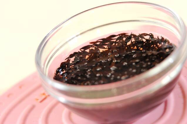 <具>を用意する。芽ヒジキは水でもどしておく。ゴボウはささがきにして水にさらす。ニンジンはせん切り、油揚げは細切りにする。