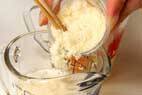卵は2個ずつ割りほぐし、生クリーム大1、粉チーズ大1、コショウを加え、それぞれ混ぜ合わせる。