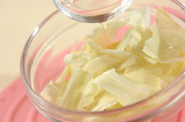 (2)にキャベツと白ワインを加え、ラップをして電子レンジで30秒加熱し、ひと混ぜする。再びラップをし、さらに30秒加熱する。(ヒント)電子レンジは600Wを使用しています。