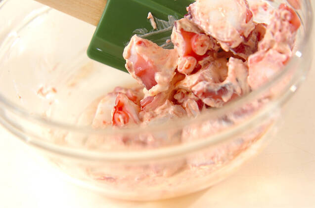 玉ネギは縦薄切りにして水に放ち、軽くもみ洗いして水気を絞る。大葉は水洗いして水気を拭き取り、器にのせて玉ネギを盛る。ゆでタコ足を1の<梅マヨダレ>と和えて、玉ネギの上に盛る。