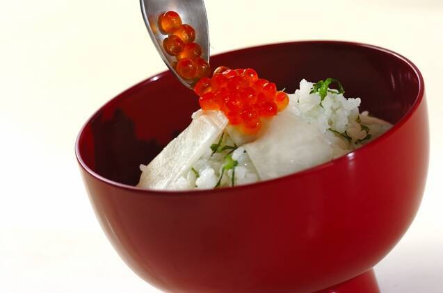 ボウルでご飯、カブ、カブの葉、ユズ汁を混ぜ合わせる。器によそい、イクラ、ユズ皮をのせる。