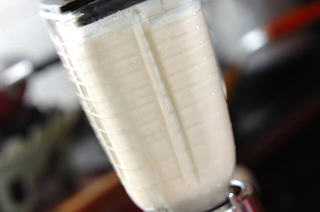 ミキサーに(1)、豆腐、牛乳を入れてよくかくはんし、網を通して鍋に戻す。