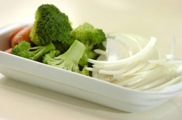 ブロッコリーは、小房に分ける。ソーセージは、斜め半分に切る。玉ネギは、縦薄切りにする。