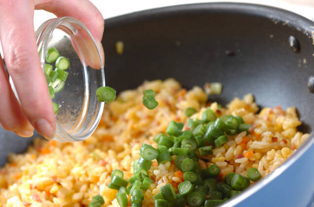 最後に鍋肌からしょうゆを加えて全体になじませ、サヤインゲンを加えて混ぜ合わせ、器に盛る。