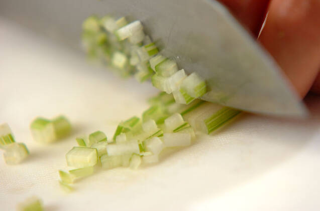セロリは筋を引いて、みじん切りにする。葉も同様にみじん切りにする。ショウガはすりおろす。