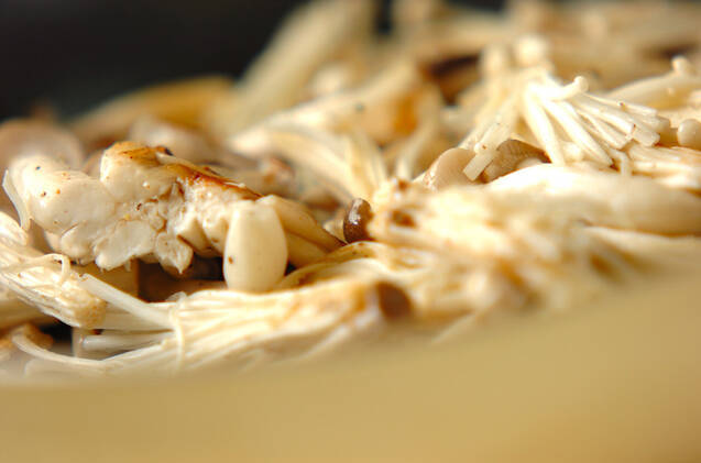 フライパンにサラダ油を入れて強火にかけ、シメジ、エノキを加え、すぐに塩コショウを少し多めに振って、しんなりするまで炒める。