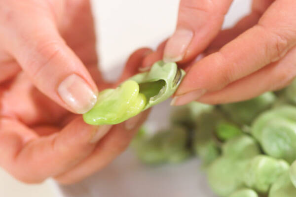 ソラ豆はサヤから出し、サッと塩ゆでする。薄皮は取り除いておく。