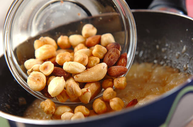 小さめのフライパンに、<ハニーナッツ>のミックスナッツ以外の材料を入れて中火にかけ、フライパンを揺すりながら少し茶色く色づいてきたら、ミックスナッツを加えて菜ばしで混ぜ合わせる。クッキングシートにひとくち大ずつのせ、ミルびき岩塩を振る。