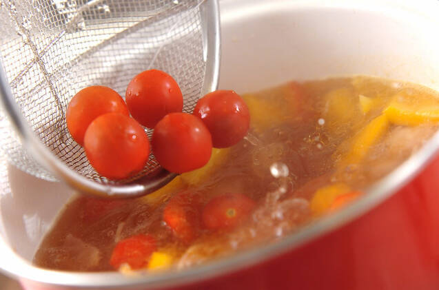 ひと煮立ちしたらアクを取り、プチトマトを加え、再び煮立ったら塩コショウで味を調える。器に注ぎ、ドライパセリを振る。