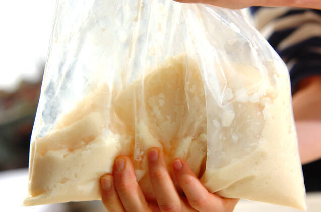 密封できる保存袋に甘酒、豆乳、ショウガ汁を入れて混ぜ合わせ、冷凍庫で凍らせる。