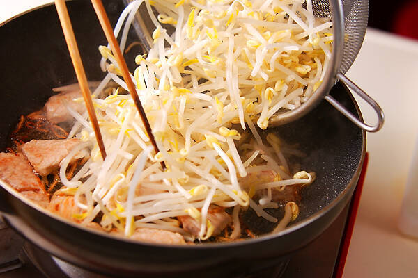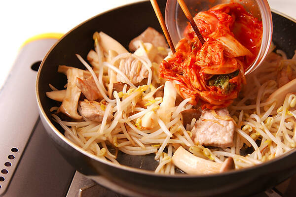 豚肉の色が変わればモヤシ、エリンギを炒め全体に油がまわれば白菜キムチを加え炒め合わせる。
