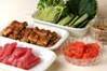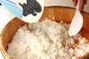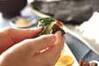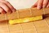 <卵焼き>の材料を混ぜ合わせる。卵焼き器を中火にかけ、サラダ油を薄く敷いて卵液を流し込み、向こう側から巻き込んで、弱火で中までしっかり焼き、巻きすで巻いて、形を整えながら冷ます。冷めればのりで巻きやすい大きさに切る。