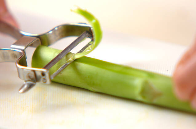 グリーンアスパラはピーラーで皮とハカマを削ぎ取り、茎の付け根の堅い部分を切り落とし、食べやすい大きさに切る。