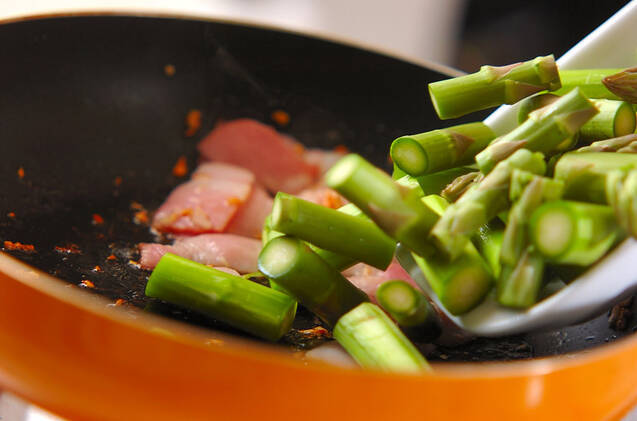 ベーコンの脂が出てきたらグリーンアスパラを加えて炒める。塩コショウで味を調え、器に盛る。